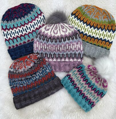 Three colorwork designs for the main hat allow knitters to choose from three-, four- or five-color palettes. Charted instructions are also written out in full. Three unique crown designs are available for all sizes, offering many possibilities from one pattern. Make your hat unique or create a whole set of hats for friends or family from just one pattern!