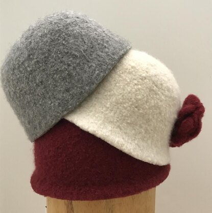 This pattern includes instructions for knitting and felting three different beanie styles. It also includes instructions for crocheting a flower. The first pattern has a slightly flared edge and is shown in cream. The second pattern is a standard beanie with a straight side and is shown in grey. The third hat has a puffy edge and is shown in burgundy. All hats can be knitted in solids or variegated yarns and both are perfect for wearing plain or with flowers, ribbons, embroidery stitches, and other decorations.