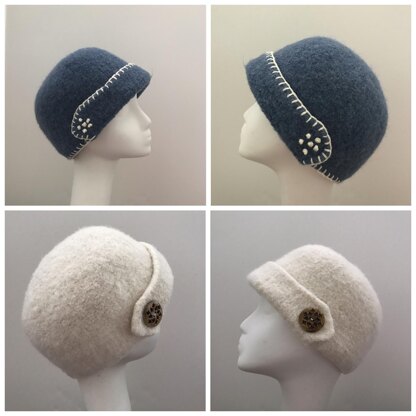 This pattern includes instructions for knitting and felting an adorable hat that is perfect for cool and cold temperatures. The style is a nice cloche and has a turned up front brim. Hats can be knitted in solids or variegated yarns and both are perfect for wearing plain or with flowers, ribbons, embroidery stitches, and other decorations.
