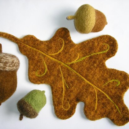 Capture the spirit of autumn with a larger-than-life felted acorn and oak leaf. The acorn comes in 3 sizes: small, medium and large. The oak leaf measures, after felting, about 19 inches long. It makes a whimsical centerpiece or trivet for your holiday table!