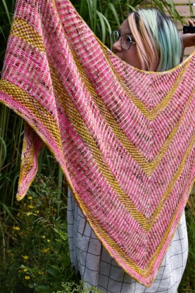 The Fernweh shawl is knit top-down in two-color brioche and one-color pearl brioche, with a garter stripe border and i-cord edges. The textural pearl brioche intersects the vertical two-color brioche lines, broken at the border by horizontal garter stripes.