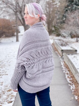 Comfy and oversized, this bolero is knit in one piece. Note: This pattern is knit flat using circular needles to accommodate the number of stitches. It is written in 3 hybrid sizes: Size A fits bust sizes 28-38” in circumference, Size B fits bust sizes 40-50” in circumference, and Size C fits bust sizes 52-62” in circumference.
