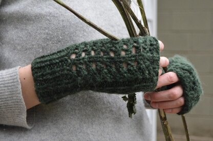 Working in the round from the wrist towards the fingers, you first choose your cuff, long or short, then work the thumb gusset, then choose mittens or fingerless gloves. The pattern is written very clearly with step by step instructions on how to create your perfect pair of gloves. They are nice and fitted to really show off the lace panel that runs up the top of the hand. The holes in the lace are offset by using bulky, alpaca yarn so in the end you still get a pair of lovely warm mittens (or gloves!)