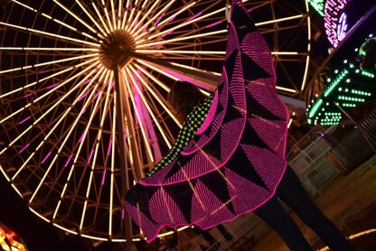This shawl, worked in two colors is a representation of the flashing lights of the Ferris wheel. It is worked in striped tiers of short rows. These stripes are not just decorative, they actually provide the shaping which creates the semi circular shape of the shawl. This pattern takes color well, so consider knitting each tier in a different color.