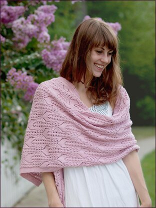 The FFCT Wrap features tulip lace flowers topping tightly cabled stems and set onto a background of a slim Feather-&-Fan leaf pattern. Instructions are given for two different lengths so you can tailor the wrap to your own requirements.