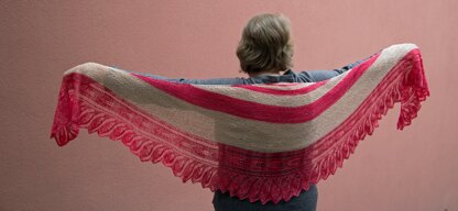 Fibonacci’s Great Grandmother is a crescent shaped shawl in two colors that are arranged in stripes following the Fibonacci sequence.