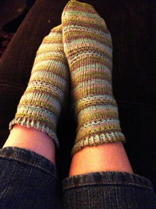 This is a pattern based on the Fibonacci Sequence, which is a series of increasing numbers, each found by adding two previous numbers together. It is a simple and easy pattern that adds interest to a plain piece of fabric without being too fussy. This sock is toe up with a short cuff.