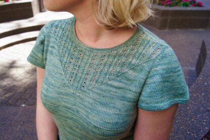 The FiDi Top, named after the Financial District of San Francisco, is the kind of warm-weather top you'll want to wear everywhere, including the office. Delicate lace and cable details mimicking the high-rise buildings of the district frame a classic neckline. The fluttery sleeves drape elegantly on the shoulders, as you gaze up at the skyscrapers about town.