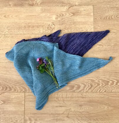 This shawl is designed using a traditional triangular construction, with increases at the beginning, the middle and at the end of each alternate row. Creating a patchwork of stocking and garter stitch sections. Reflecting a countryside walk through the fields and woodlands of Norfolk (UK).