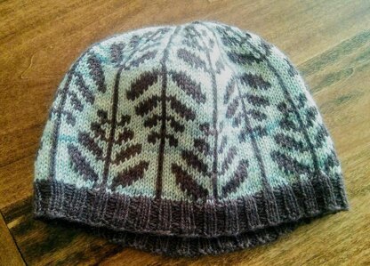 This fun hat is inspired by my love of ferns. It is knit in the round, with simple decreases at the crown. It knits up quickly and makes a great gift for yourself or others.