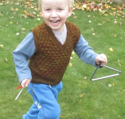 Field of Sheaves is a vest for children. The name comes from the Cluster of Wheat stitch that is worked all over the garment. The vest is worked in the round up to the armholes, then, after dividing, the front and back are worked flat. The shoulders are seamed with a three-needle cast-off. Stitches are picked up around the armholes to work borders, and around the neck to work the V-neck band.