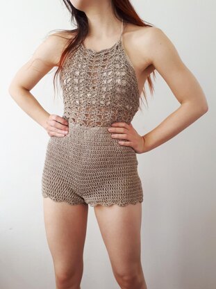 This romper is really amazing. I love the drape of the yarn as it is like my second skin, that is why I would advise you to use yarn that has drape (linen and viscose blends). It is great as a swimsuit cover-up, or for a chilling in a hot weather with cute bralette or crop top under.