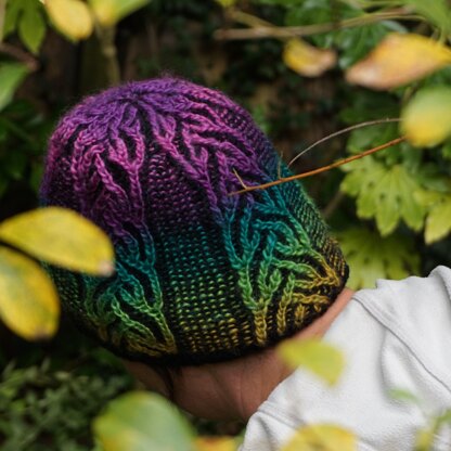Fīfta, (pronounced feef-ta) is the Old English word for fifth; a very fitting name for this hat. I see many designs that are based on quarters, sixths or eighths, but it is less often that the odd numbers get a look in. So, this hat celebrates the fifth in all its glory. Five plaited brioche columns are separated by five areas of colourful garter stitch. You can also choose between a classic beanie and a more slouchy shape.