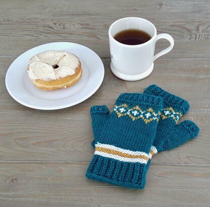 In Swedish culture, a “fika” is a coffee break, an opportunity (however brief) to relax and enjoy a sweet treat. These mitts were inspired by that philosophy, by using knitting as a way to relax with a quick and colorful project in the middle of your daily routine. The Fika Mitts are knit in the round from the cuff upwards. The thumb gusset is worked simultaneously with the hand. The mitts are intended to fit more loosely around the wrist and more snugly around the hand. Choose the size where the finished knuckle circumference is smaller than your actual knuckle circumference.