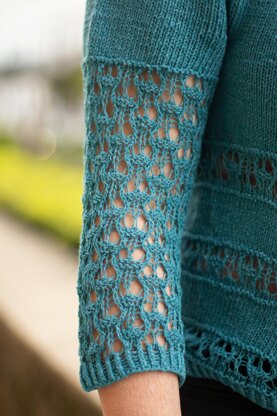 Fiigrana es una camiseta de verano/entretiempo muy ligera que te recomiendo tejer con una fibra muy fresquita, como por ejemplo la seda o el lino. Tiene la particularidad de que va combinando el calado a una hebra y el resto a dos hebras de hilo grosor lace, lo que le da un efecto de sutileza muy particular. Si no te apetece que el calado quede tan abierto, puedes tejer toda la camiseta en grosor fingering o a doble hebra de lace.
