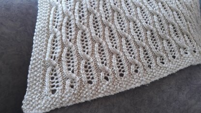 Effective cabled lace pattern blanket, edged with a moss stitch border. Knitted in one piece.