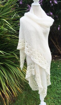 Fine Fluffy is a large, soft and fluffy elegant wrap, just glorious to drape around your body.  Two hanks of Fluffy B are used to create the main body of the shawl and one hank of Warm Moonshine used for the accent motif pattern. You increase each side of the spine by the yarn-over method.