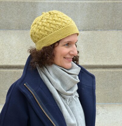 This hat features a simple but stunning all-over cable pattern and is topped off with a little stem of i-cord worked from the last few stitches left at the top of the hat before binding off.