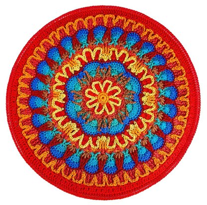 Fire and Ice Mandala is a lovely textural crochet piece featuring overlay crochet that can be used as a wall hanging or table mat. E-pattern includes round-by-round photographs. Piece may be mounted in a metal macrame ring for hanging if desired. Made with weight category 4 (worsted-weight) yarn, Fire and Ice fits a 19" ring; made with weight category 2 yarn, piece fits a 14" ring. Skill level: intermediate.