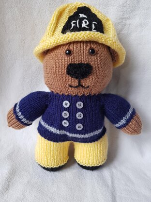 A cute knitted Firefighter bear. He is a variant on the doctor bear, designed following a request from a little boy who is mad about fire fighters. He stands at 26cm when knitted on 3.75mm needles and using double knit yarn.