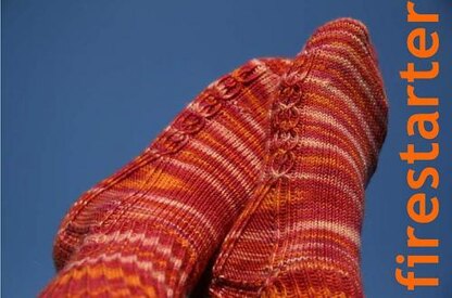 Hand dyed, beautiful variegated yarn hardly needs anything other then a couple of smart details. To meet that requirement, Firestarter not only has plenty of stockinet stitches, but each side of the foot has twisted stitches that pop out beautifully and keep you busy. Upon reaching the gussets, the side cables will split up and frame the purled gusset stitches. After turning the heel, the cables will twist back together and at the same time, smoothly ‘locking’ the gusset. The ribbed cuff has a tiny bit of shaping to fit the natural contour of the leg.