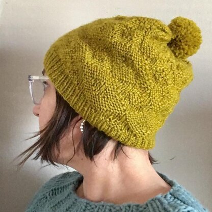 Yarn: The Fibre Co Cumbria (worsted-weight, 90% wool/10% mohair, 100g/238yds) 1 skein in “Buttermere” Needles: US 5 (3.75MM) 16” circular needle, US 7 (4.5mm) 16” circular and dpns (OR SIZE NEEDED TO OBTAIN GAUGE) Notions: stitch marker, blunt needle for weaving in ends Gauge: 19 sts and 26 rows = 4” in knit/purl diamond pattern