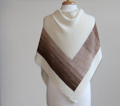 A casual garter wrap is the perfect accessory for the warm days and cool nights of late summer and early fall here in the northern hemisphere. This triangular shawl uses a gradient set of 5 plus 550 yards of the same base in a very light color that plays nicely with your gradient. Natural, white, or very light grey are good options for most gradients. (You could also make your MC very dark and work the gradients in reverse order.)