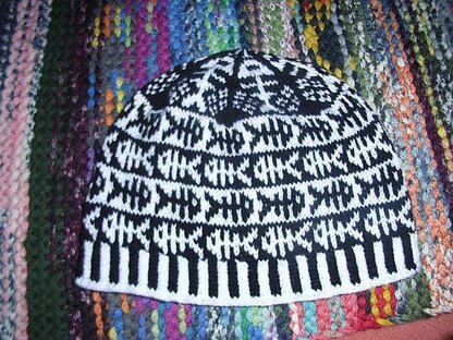 I love this cute fish and bone beanie! It comes in two colors. Knit it in your favorite ones, has a two color ribbing and funny comic fish skeletons all around. The crown has a fish skeleton top and looks like a star :)