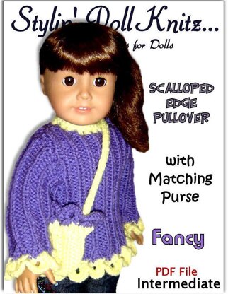 Pdf doll knitting pattern, fits 18 inch and American Girl dolls. Lovely scalloped trim sweater with matching shoulder bag. Looks fantastic when done in Easter colors.