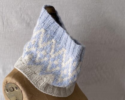 A comfy winter cowl, with a graphic stranded colorwork pattern motif inspired by mountain peaks Knit in the round from the top down. After the initial ribbing, stitches are increased for a slightly conical shape.