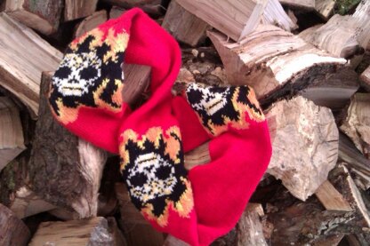 Keep your neck toasty with fire and bones. Designed to be knit to your desired length, this flamin’ hot infinity scarf is fully reversible with the working side of your knit completely hidden. Working the chart is a labour of love that either requires stranding multiple colours at once or duplicate stitching after the main colours are complete. The end knit is well worth the effort so hang in there! The chart would also make a great addition to a sweater sleeve.