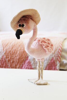 Crochet flamingo toy pattern is in PDF format in English (US terms) language. Crochet level: beginner The pattern consists of 22 pages and is accompanied by more than 60 photographs. The finished product using the materials stated in this pattern is ~9.8 inches / 25 cm in height and ~5.9 inches / 15 cm in width. The flamingo is crocheted as one piece using the wireframe. It can move the legs and neck. You sew the wings, legs, hair, eyes, and nose. The cap is crocheted separately and decorated with a flower.