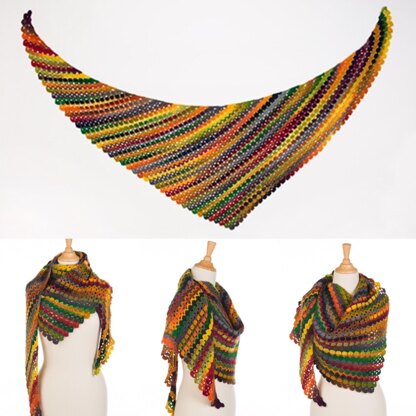 Using a stunning variegated yarn for this sideways shawl, worked from the bottom point upwards.  Row after row your shawl gets wider and larger.  Choose your own size by working more pattern row repeats.  Finish the shawl with a clever ‘finishing row’.
