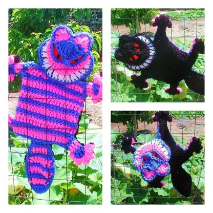Fantastically striped cat on one side, invisible cat just wearing a smile. Pictures of many of the steps. American Crochet terms