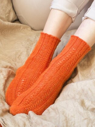 These socks are worked from the toe up, with a pattern of simple lace and moss stitch columns, which flow naturally into the cuff ribbing. Instructions are given for using the magic loop method on circular needles. The foot and leg length are customisable.