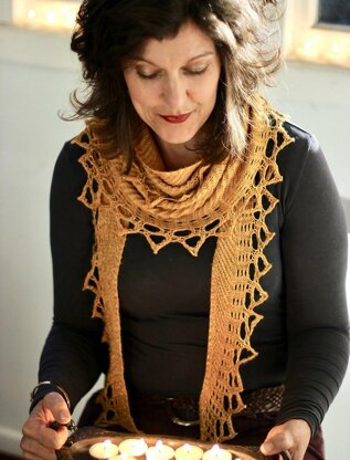 Knitted in one piece from corner to corner Flicker is a stunning, lightweight shawl edged with lace, evoking the magical glow cast by dancing flames.