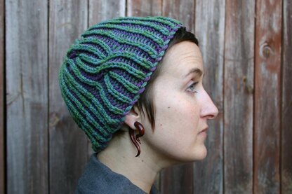 Thick squishy fabric, an elegant single cable, and graceful decreases come together in this fully reversible two-color brioche stitch hat. Much simpler than it looks, this is a perfect introduction to brioche knitting. Choose yarns with a contrast in value (lightness/darkness) as well as in color for the best effect. The stitch is very stretchy, so if in doubt about which size to choose, pick the smaller one.
