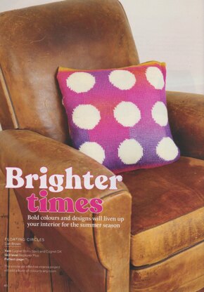 This is a pattern for Floating Circles Cushion Cover, originally published in Knitting magazine. It is in stocking stitch with simple circle intarsia motifs on the front, moss stitch edges. Photos Knitting magazine.