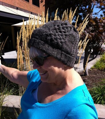 The cap starts with 3 inches of ribbing, which you can increase or decrease depending on personal choice. It then goes into a Saxony Braid and a cable panel pattern up the sides, with the Saxony Braid being repeated three times while working the cable panel chart. The top is a simple round decrease pattern and you can add a pompom, or a length of i-cord to finish off the top if desired.