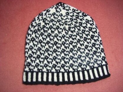 It starts with a two color ribbing, and it has sheep allover! Even at the top. Right at the top is a little star.
