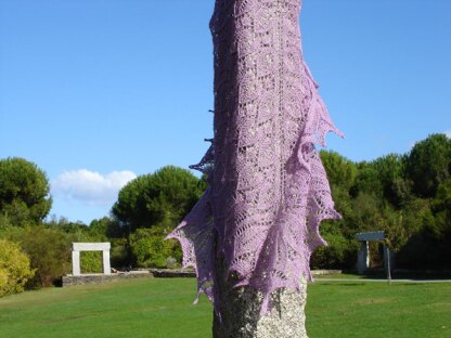 Flor is a seamless triangular shawl slightly heart shaped that stays beautifully in place due its form (you may block it as a perfect triangle instead if you'd like). The main body has pattern stitches resembling leaves and flowers alternating in a fluid movement from the middle back outwards to the edging which has an expressive floral element placed into shawl’s spine and near each border. The edge has also been embellished with beads for additional loveliness.