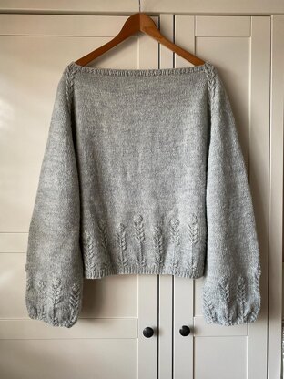A relaxed, boxy fit sweater with a boat neck, and slight balloon sleeves. This sweater is worked in one piece in the round from the bottom up. It has a leaf sprig stitch around the bottom hem and cuffs, with an embroidered flower (this leaf stitch panel is charted). The body is worked in stocking stitch, with the raglan decreases concealed behind the leaf stitch. The body and sleeve lengths are written using standard UK dressmaking measurements, but can be adjusted to suit individual measurements, and the pattern indicates when to do this.
