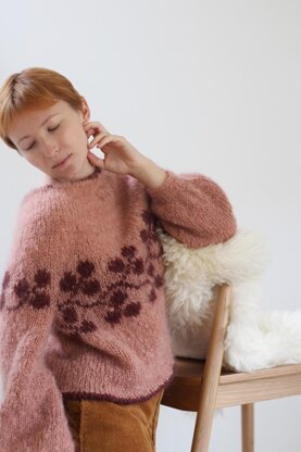 The pullover is worked top down seamless in the round, featuring floral colourwork running across the bottom of the yoke and continuing on the body. Sleeves have an elegant balloon shape, and both bottom and neckline edges are finished with stockinette hem in contrasting colour. Instructions for a classic fitted sleeve are also provided.