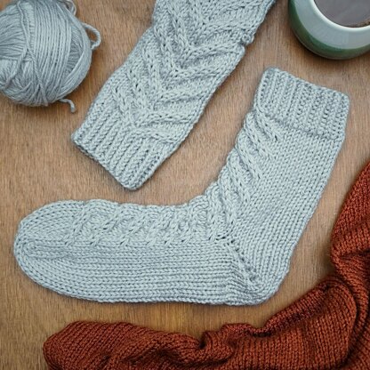 Slip into warmth and comfort with the Florrence Socks, a chunky and cozy pair of bed socks designed for effortless relaxation. Knit using Drops Alaska yarn and 5mm needles, these socks work up quickly and feature a simple cable pattern down the front, making them perfect for beginners looking to try sock knitting and cabling.