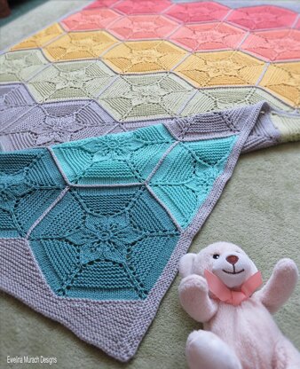 Flower Blanket is made of hexagon-shaped modules with a flower motif combining lace, stockinette and garter stitch. Each hexagon is worked from the centre of the flower outwards and the modules are knitted together−detailed photo tutorials showing how to cast on and how to join the modules are included in the pattern. You can arrange your hexagons in stripes of the same colour or randomly. The latter method will allow you to use up small amounts of yarn left over from other projects, as each hexagon only uses approximately 48 metres/53 yards of DK yarn. The pattern is written for one size in DK weight yarn, but you can make your blanket any size you want, with any yarn weight−just change the number of hexagons and adjust needle size to suit your yarn.