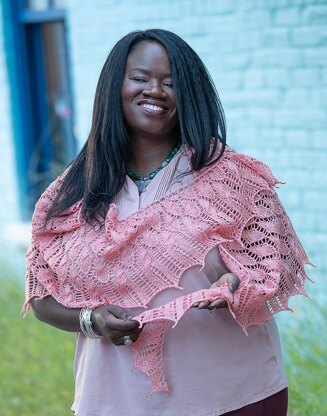 Simple cables and lace stitches come together in this lacy, motif shawl. The easily-memorized lace pattern may be worked from charts or written instructions and is perfect for some relaxed, outdoor knitting.