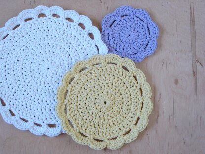 Crochet placemats are a beautiful table decoration, whether for tableware or as an decoration in itself. This easy crochet pattern will allow you to make sturdy circular placemats in three sizes with a floral motif. Possibilities are endless: make all in one color, every single one in different color or every size in different color! Pattern includes written instructions in English and chart.
