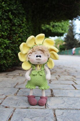 Crochet flower toy pattern is in PDF format in English (US terms) language. Crochet level: beginner The pattern consists of 25 pages and is accompanied by more than 60 photographs. The finished product using the materials stated in this pattern is ~12.5 inches / 32 cm in height without the petals. The flower is crocheted as one piece with the wireframe. It can move the legs and arms. You sew the eyes, nose, and ears. All clothes are crocheted separately and removable. The pattern includes the doll + set of clothes (flower hat, overall, boots).