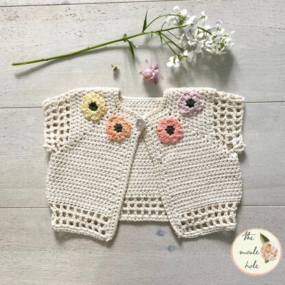 This is a super easy and quick summer cardigan/bolero/shrug. It is perfect to wear with summer dresses. The flowers are so fun to make and since this is made with cotton aran it works up so quickly!