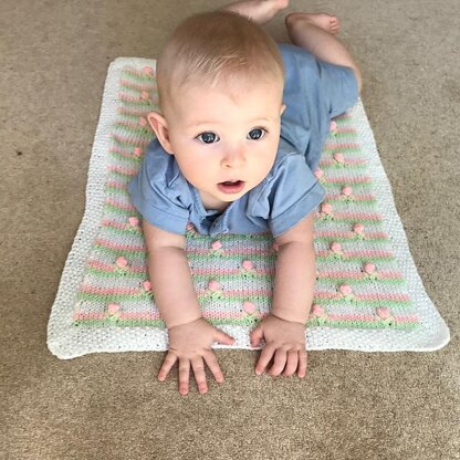 The blanket is knitted flat from the top down, with a seed stitch border at the top and bottom. The side borders are added when the main piece is complete, and the mitred edges joined to give a neat result.